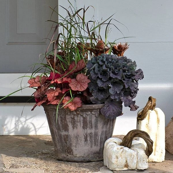 In climates where winter temperatures drop well below freezing, containers should be dismantled in late fall. The Panicum and Heuchera are perennials and they can be planted in the ground. Simply discard the Cabbage, which is an annual and will not survive in areas below 20°F. In mild-winter climates (Zone 8 and warmer), these plants can be left outdoors in containers.