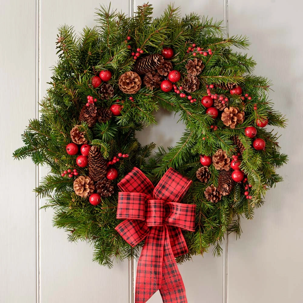 Our Cabin in the Woods Wreath captures the essence of a traditional Christmas with its festive assortment of Pine and Spruce cones mixed with faux Crabapples and sprigs of Winterberry Holly, all atop a round of fresh evergreens. The red-and-black plaid bow adds a final touch of rustic, homespun charm.