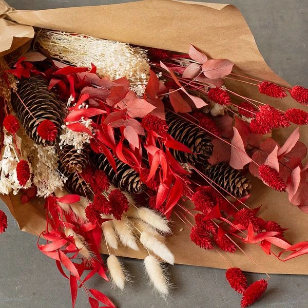 A festive, everlasting dried bouquet to put you in the holiday spirit! Cozy and bright, this large bundle of vibrant reds, snowy whites and natural browns will keep you warm all winter long. With elements such as bleached bunny tail, preserved red eucalyptus and gorgeous novelty Pine cones, Candy Cane will keep you company as you watch the snowfall outside. Also the perfect dried bouquet to send to loved ones you canât be with this holiday season. All dried products. Exclusive.