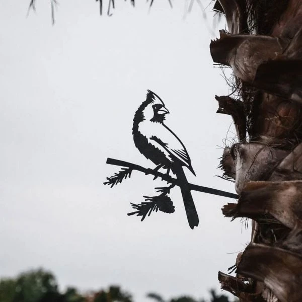 The red male cardinal was the model for this decorative metal ornament, which captures the silhouette of the bird perched on the branch of a Pine tree. The ornament is crafted from steel that develops a patina over time. The flat silhouette includes a spike. Hammer it gently into a fence post, mature tree or garden shed. Take care to choose a spot with a bit of open sky behind it, the better to show off the bird’s contours.