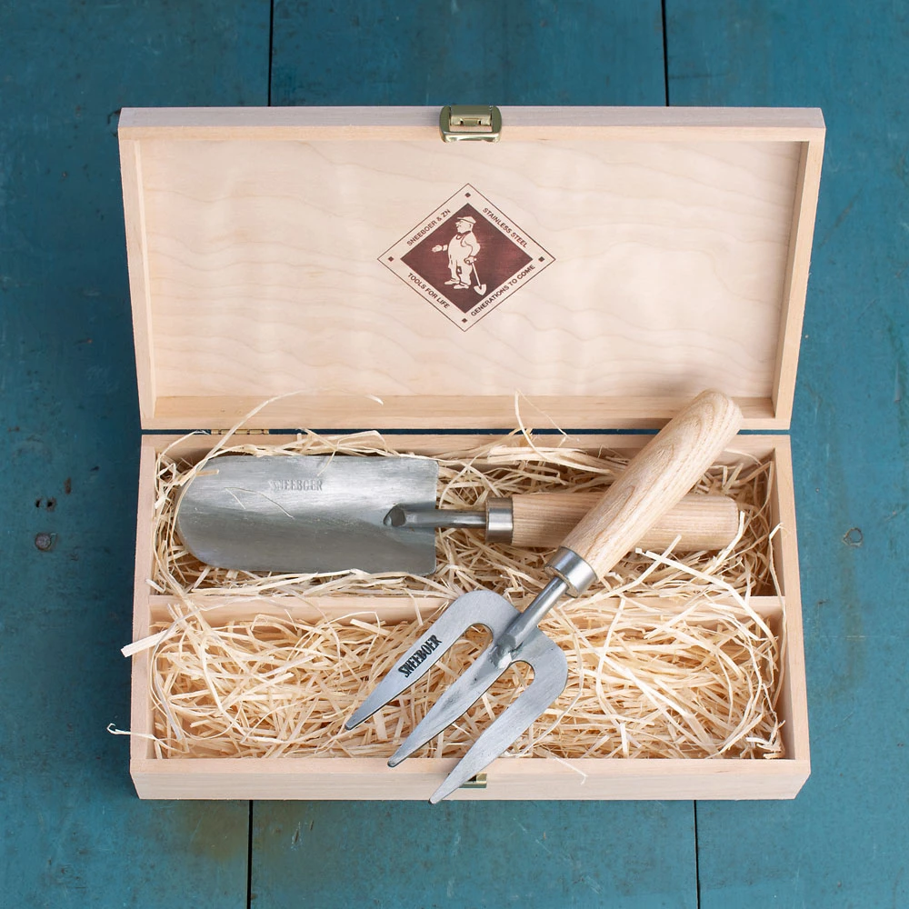 Start a child on a lifetime of gardening adventures with a pint-size Sneeboer Childrenâs Hand Tool Set beautifully crafted and made specifically for smaller hands. Sneeboer is renowned as a producer of premium, superbly made garden tools, and the Dutch company has put all of its expertise into these smaller scale implements, which are great in the garden. Each set contains a trowel and a weeding fork. Both are compact and light and made of hand-forged solid stainless steel with FSC-certified Ash wood handles. The durable, lasting tools come in a wooden box that is perfect for passing down through generations.
