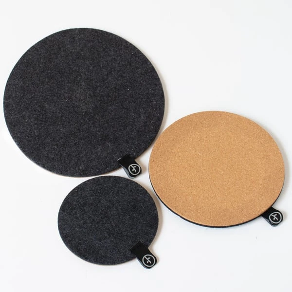 Protect furniture and floors from scratches and moisture with these innovative Cork and Felt Plant Trivets, in a convenient set of three standard sizes. The trivets feature cork on one side, and a soft, wool-blend felt on the reverse. A swivel tag allows you to rotate the plant easily for watering or to adjust the sun exposure. The neutral colors in the trivets blend seamlessly with your plant pots and décor. Made in the USA