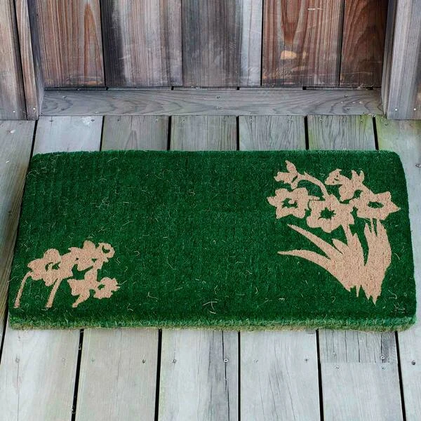 A hunter green background sets off the floral motif on our Dancing Daffodils Outdoor Mat, handwoven in 100% Coconut fiber that stops dirt in its tracks. The doormat showcases a graphic inspired by collections in The Colonial Williamsburg Foundation, designed exclusively for White Flower Farm and hand stenciled using eco-friendly dyes. Cleanup is simple with a quick shake, sweeping, or vacuuming. We recommend placing the doormat under a sheltered area.