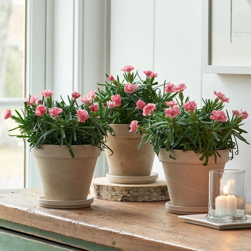 We like Garden Pinks as a houseplant because it blooms for weeks and offers a sweet, spicy fragrance that is completely unexpected indoors. The variety called Dianthus âLittle Pinkâ is an exceptionally heavy bloomer, and we offer plants that are bushy and round, with their buds set. Placed in a cool sunny window, they will bloom within several weeks of arrival. When spring finally arrives, you can plant them outdoors, where they will provide color and fragrance for years to come. We ship 3 plants in clay pots that measure 5″ wide x 4œ” tall. Saucers included.