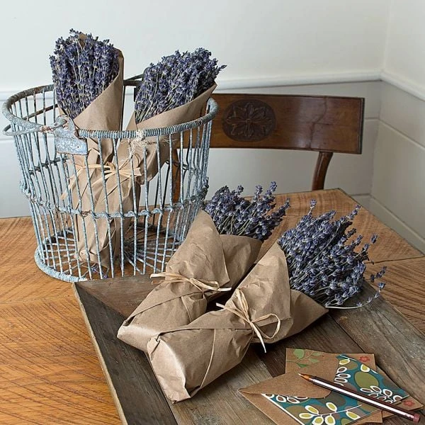 Bring the beautiful blues of Lavender indoors with our fragrant bundles of dried flower stems artfully wrapped in brown craft paper. When placed in a basket or displayed on a shelf or table, they add natural beauty to an office, kitchen, or bath while subtly perfuming the air with their soothing, all-natural fragrance. Makes an enduring gift for someone special, too. Each bundle measures approximately 14âł long x 4âł wide. We ship a set of 2 bundles that are best displayed in their craft paper.