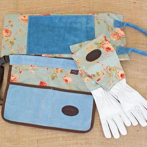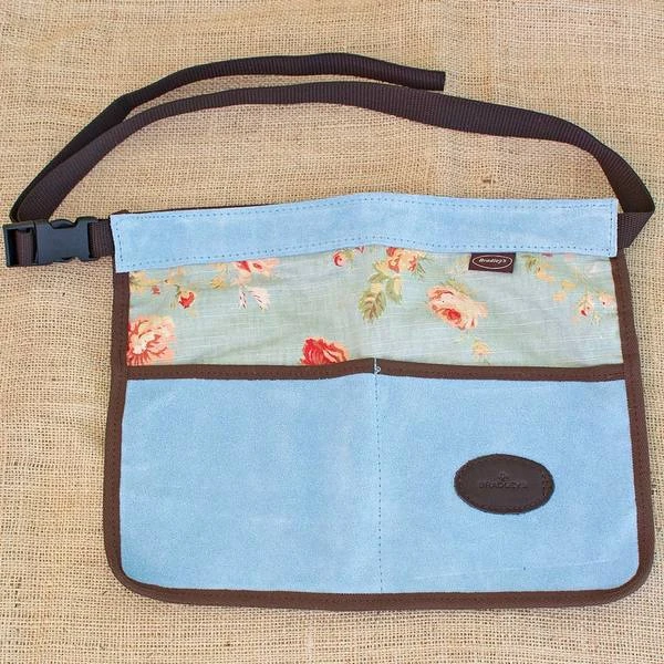 Our English Rose half gardening apron is made in a sturdy combination of leather and linen, and features a botanical print recalling a vintage toile. Make light work of carrying your small gardening implements or bulbs within the apron’s two generously sized pockets. The rugged webbed nylon waist strap adjusts to fit any size, and secures with a durable plastic clasp. This half apron is an indispensable tool for any gardener, but also makes an inspired gift. Handcrafted in Shropshire, England.