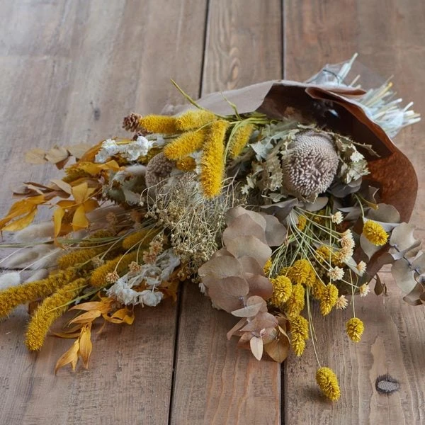 Warm mustard and golden yellow botanicals blend with soft neutral dried elements to make this radiant bouquet. The rich tones of mustard Eucalyptus, Phalaris and Millet combined with creamy Proteas, broom and bunny tail grasses are reminiscent of a golden, light filled autumnal afternoon. All dried products. Approximately 30″ tall. Exclusive.