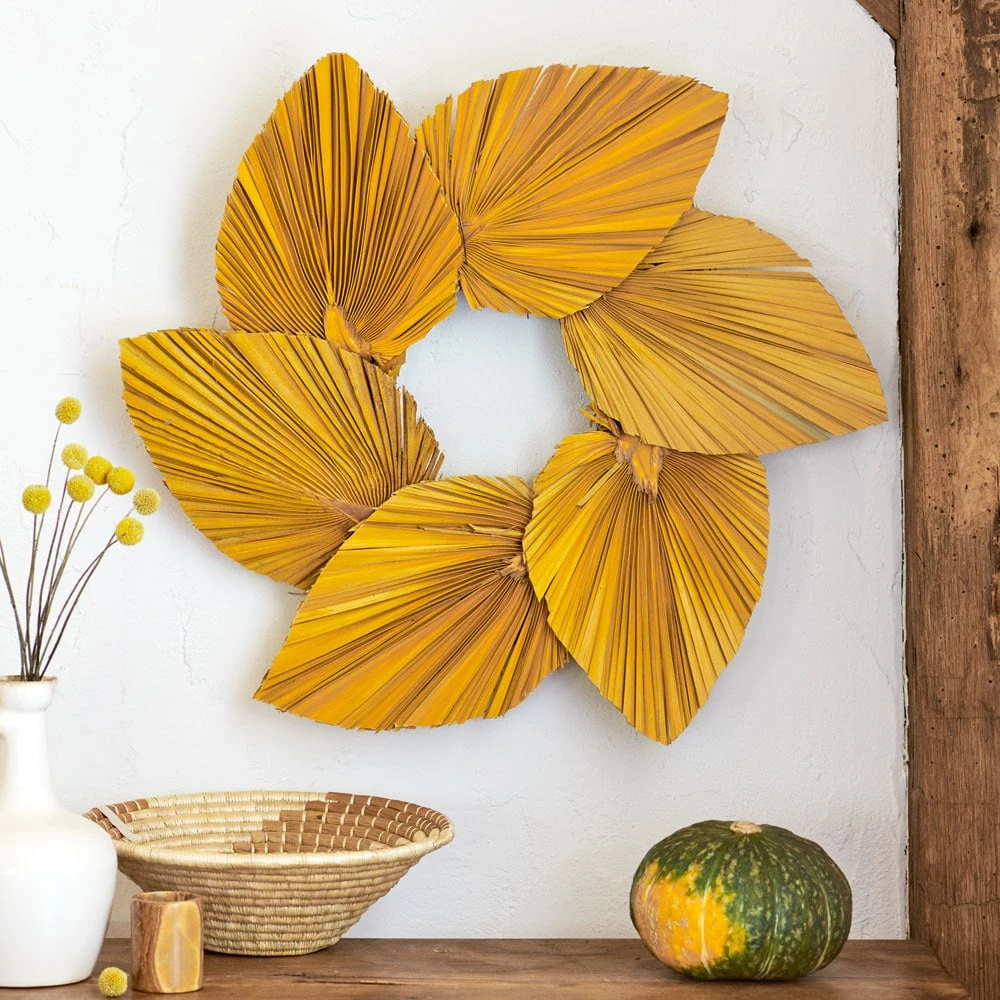 For a dramatic design statement that adds a tropical touch to any décor, we love the bold form and style of our Golden Palms Dried Wreath. Natural Palm fronds are hand-painted Ceylon yellow then cut to a uniform size to create this terrifically textural pinwheel.