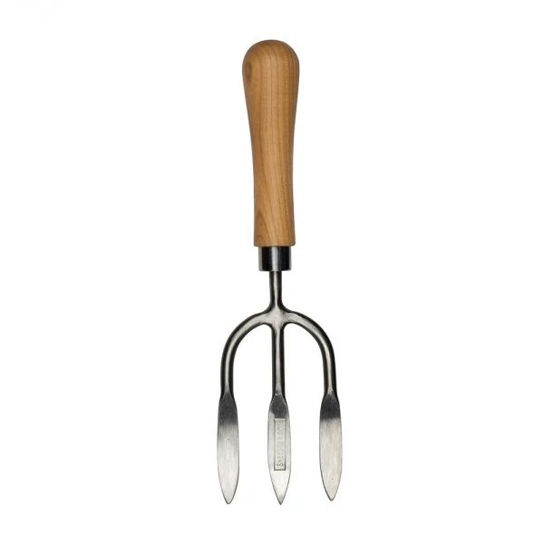 Get under weeds, shallow rooted plants, and loosen small patches of soil with this sturdy, durable weeding fork. Made in traditional fashion, it has a hand-forged stainless steel fork with 3 hammered tines. The Cherry wood handle is smooth and tapered to fit comfortably in the hand. As you can well imagine, we put our weeding fork to good use around the nursery. Built to last, this makes a nice heirloom to hand down to gardeners of the next generation. Overall length: 11″.
