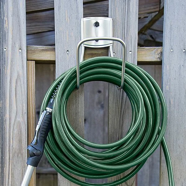 With our Heavy-Duty Hose Holder, spend less time untangling messy coils and straightening out kinks, and more time enjoying your garden. The sturdy and sleek design of this wall-mounted, stainless steel hose holder will keep your hose off the ground, neatly coiled, and clean. Our rust-proof, industrial-strength holder will store up to 125′ of large diameter, 5/8″ hose. Quick and easy installation.