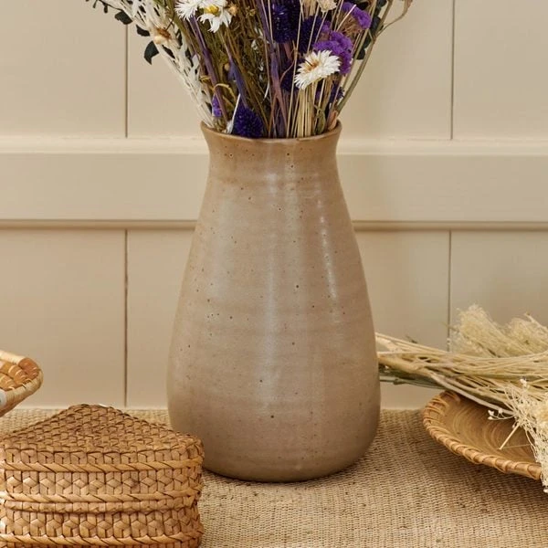 A speckled finish adds a unique, earthy quality to this classic curvilinear vase, a lovely interior accent. Soft, neutral tones in the glaze serve to highlight colorful bunches of fresh flowers or dried floral arrangements. This vase features a rounded bottom that tapers to its flared rim, and beautifully complements other elements in your décor without clamoring for attention. Dried flowers not included.