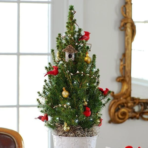 Anyone who loves cardinals and the woodland in winter will delight in this merry dwarf Alberta Spruce tabletoop tree decorated with likenesses of the bright red birds, a tiny birdhouse, a garland of white faux berries, and golden orbs. Shipped in a 7″ wide x 8″ tall metal cachepot. The tree arrives pre-strung with white LED lights.