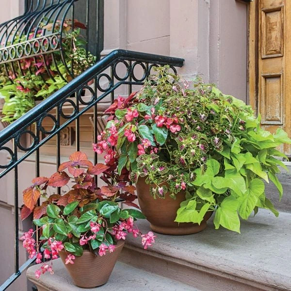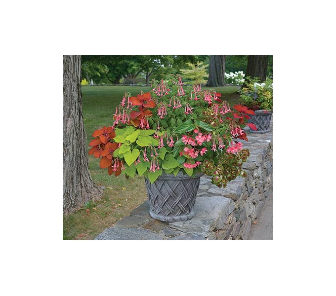 Plenty of pink, coral, and red shades here, which will catch the attention of hummingbirds and draw them in for further inspection. Their sweet reward lies within the blooms of Fuchsia ‘Billy Green.’ 2 plants of the Begonia, 1 each of the other varieties. 6 plants total. Exclusive. Container not included.