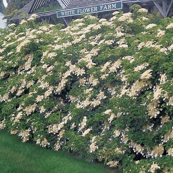 Climbing Hydrangea plants have lateral branches that grow out as much as 3′ from the supporting structure, giving a rich, deep texture that is quite unlike that of other vines. The dried flower heads and reddish brown, peeling bark are attractive in winter. Produces aerial roots that cling to its support. Not well adapted to the dry heat of desert regions. Blooms on old wood.