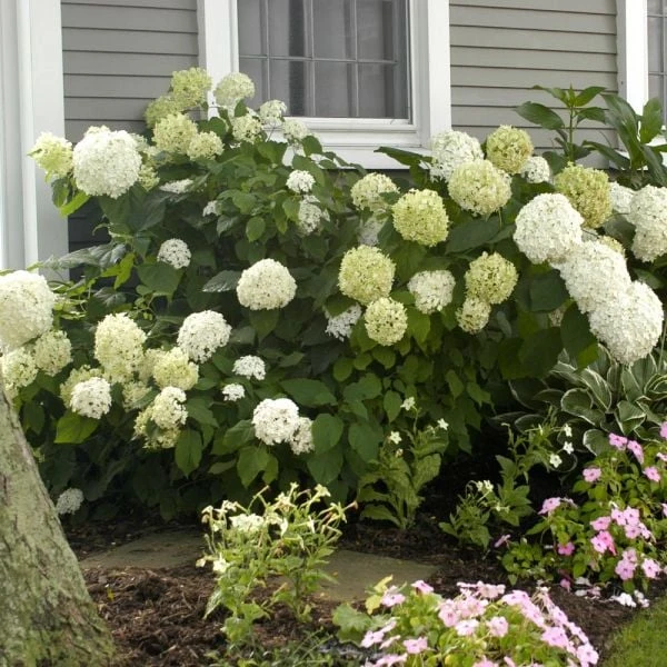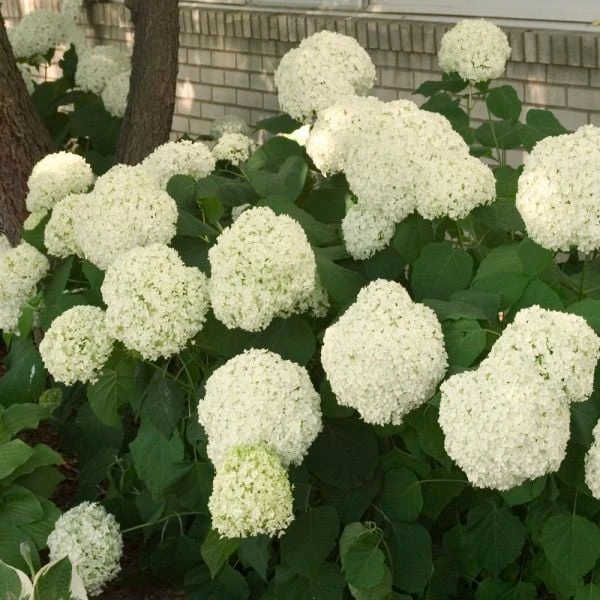 Hydrangea arborescens ‘Annabelle’ is a mounding shrub that grows 3–5′ high with a wider spread. In July, it produces huge (8–12″) round heads of pure white blooms that remain attractive into September and can be cut for fresh or dried arrangements.