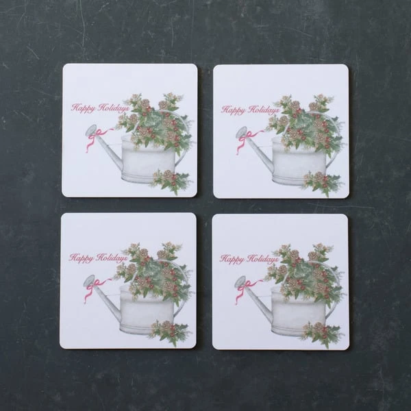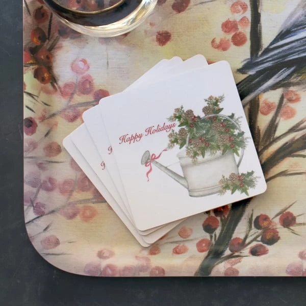 A festive watering can brimming with evergreens, Holly, and Pine cones is portrayed on our set of In the Garden Holiday Coasters, seeming to declare the gardening spirit to be very much alive despite frost and snow. Featuring original artwork by New England artist Betsy Barry, these four charming coasters are handcrafted in Scandinavia of a Birch veneer sourced from certified sustainable forests and sealed with a thin melamine coating to protect the wood.