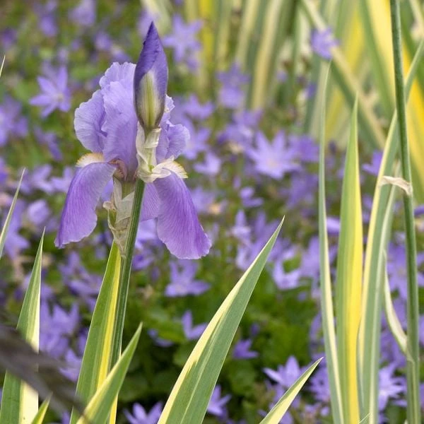 Graceful Iris pallida ‘Variegata Aurea’ has been a favorite in our gardens for years for its form, color, and fragrance too. When the golden striped foliage is backlit by the afternoon sun, the effect is glorious. We love it tucked behind the mounded forms of Geraniums, or in front of tall perennials with densely packed flower spikes, such as Foxgloves.