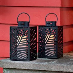 Create a warm, vibrant ambience for your next evening event, dinner party, or night on the patio with our Leaf Lanterns. Each rectangular panel of these large, metal luminaries depicts an abstract foliage pattern that is absolutely stunning when silhouetted by candlelight. Insert the candles of your choice through each lantern’s hinged door then use the latch to close it tight. The lanterns are painted black to blend easily with any décor.