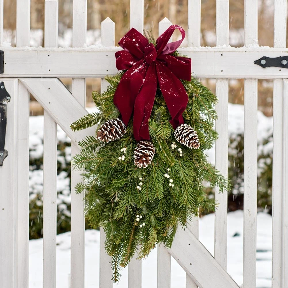 Evergreen boughs, frost-tipped Pine cones, faux white berries, and a deep red velvet ribbon are combined to create our Merry in Maroon Holiday Swag. The traditional and timeless style reawakens the magic of the holidays. The Pennsylvania Douglas Fir and Fraser Fir evergreens have a wonderful textural presence and they carry the scent of the season. The swag can be displayed indoors or outside. It will stay fresh longer in cooler temperatures.