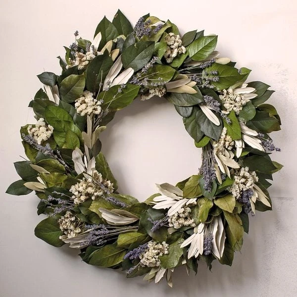 Bunches of dried Lavender, clusters of white Statice, and the lance-shaped leaves of Integrifolia adorn the beautiful Montecito Floral Wreath, adding textural layers to a ring of matte green Salal leaves atop a twig base. This is a lovely, lasting indoor accent for any room, in any and every season.