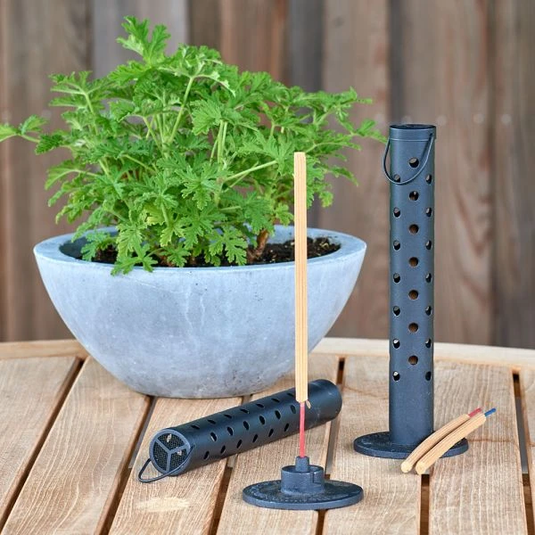 Help disperse the mosquito-repelling smoke of burning Sandalwood sticks with this portable, lightweight diffuser. Equipped with a handle for easy carrying, the diffuser stays cool to the touch and safely protects children and pets from coming into contact with the burning sticks. These sticks are infused with an aromatic, woodsy blend of essential oils that repel pesky mosquitoes. Purchase multiple diffusers and place them about 10′ apart at ground level for best coverage. Set includes 1 diffuser, 1 Sandalwood stick, 1 Sandalwood stick with Jasmine oil, and 1 Sandlewood stick with Ylang Ylang oil.