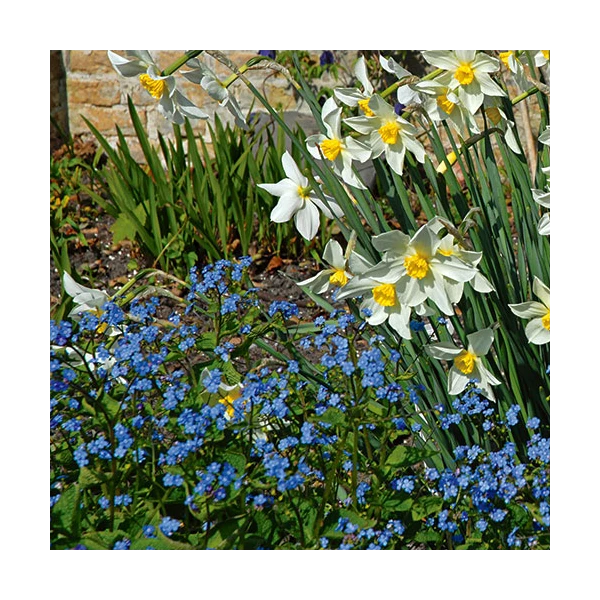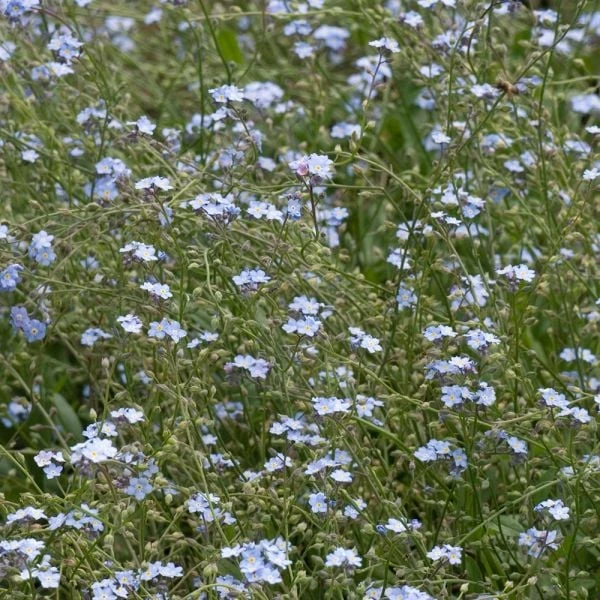 Forget-me-nots (Myosotis sylvatica) form clouds of small, blue flowers that are long-lasting complements to spring-blooming bulbs, especially Tulips. Myosotis self-sows readily, which is an advantage with this biennial or short-lived perennial. We refrain from deadheading all of the plants in our borders, and by late summer seedlings have appeared that will bloom in spring to early summer the following year.