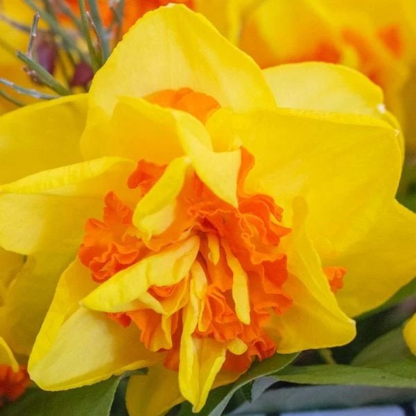Go boldly into spring with the showy, colorful, fragrant blossoms of mid-season double Narcissus ‘Vulcanello.’ Layers of greenish-yellow petals encircle a center of wavy, bright orange corona segments. Midseason.