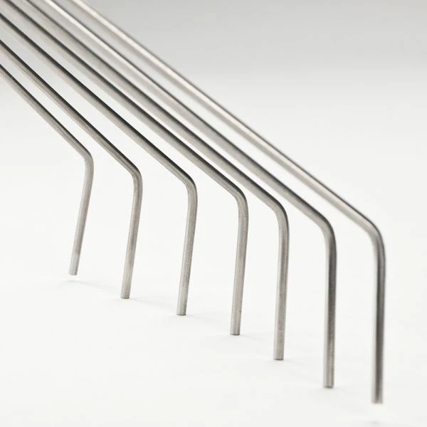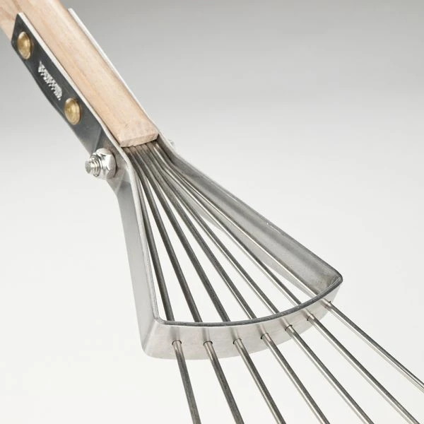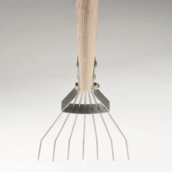 Designed in collaboration with a renowned English Rose breeder, this thoughtfully engineered Narrow Space Leaf Rake has 7 stainless steel tines that aerate the soil and remove weeds as you’re raking. The tines are held firmly in place by a steel brace, which secures the tines so they won’t wobble or stray as you rake up spent flower petals and leaves in tight spaces. Indispensable, and built to last a lifetime. Overall length: 63″.
