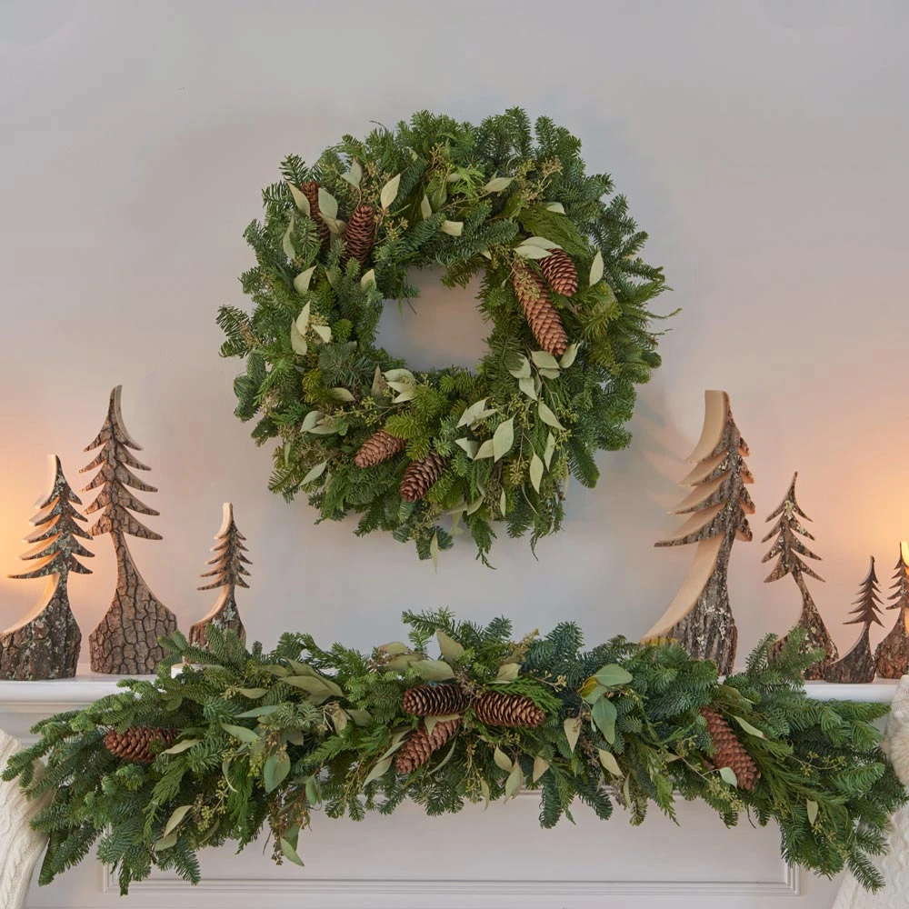 Some of Mother Natureâs most treasured seasonal ornaments come together in our naturally fragrant North Bend Runner. Boughs of freshly harvested, aromatic Noble Fir are wired to form a gently curving crescent then decorated with the sage-colored foliage and bead-like sprays of Seeded Eucalyptus, feathery sprigs of Cedar, and Spruce cones. The runner makes a beautiful, seasonal accent indoors on a fireplace mantel or sideboard, but it will stay fresher longer if used outside above a doorway or on a window. Also available in this collection are a wreath, a centerpiece, and a garland.