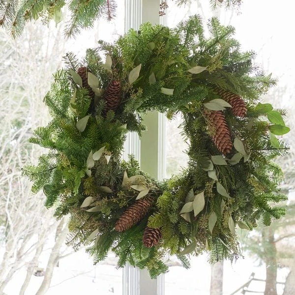 Some of Mother Natureâs most treasured seasonal ornaments come together in our naturally fragrant North Bend Wreath. A full ring of freshly harvested, aromatic Noble Fir is decorated with the sage-colored foliage and bead-like sprays of Seeded Eucalyptus, feathery, deep green sprigs of Cedar, and three pairs of Spruce cones. The wreath is a perfect companion to the other pieces in this collection, which include a runner, a centerpiece, and a garland. The wreath can be displayed indoors or outside. It will stay fresher longer when used in outdoor settings.