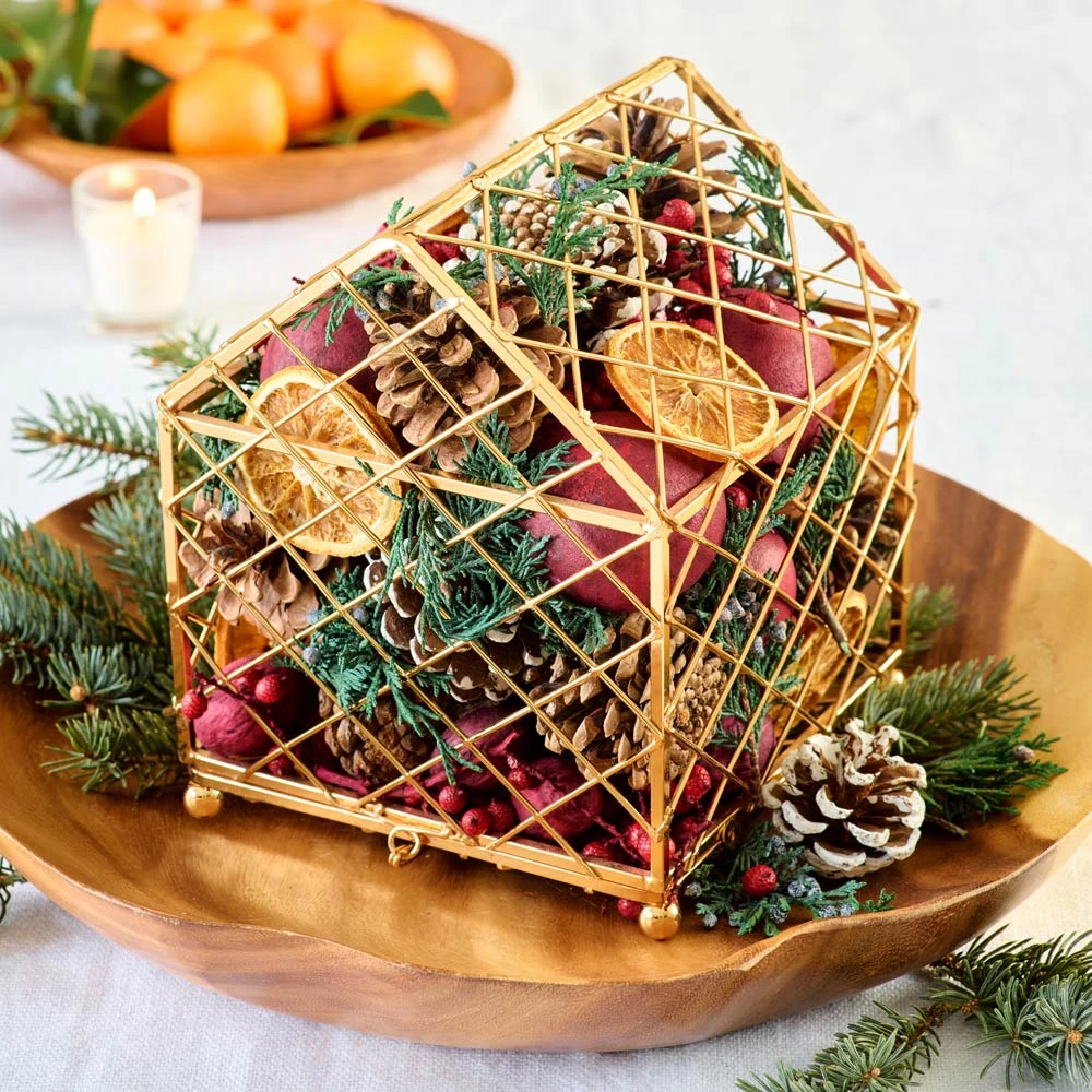 Scents of Orange, cider, and Cinnamon are broadcast by a botanical mix that finds a literal home in the gold wire form of our Orange-Spice Potpourri Cottage. Blending charm and seasonal fragrance, the golden abode, made of decorative wire, houses an attractive, colorful, California-made mix of Orange slices, Cinnamon sticks, Pine cones, and other botanicals, all pre-scented with fragrances of Coconut, Orange, Peach with Cinnamon, and berry blossom, and base notes of Vanilla bean and Clove. Set this beguiling and fragrant decorative accent on a sideboard or coffee table and fill a room with fabulous fragrance for the holidays. Great for gifting, too.