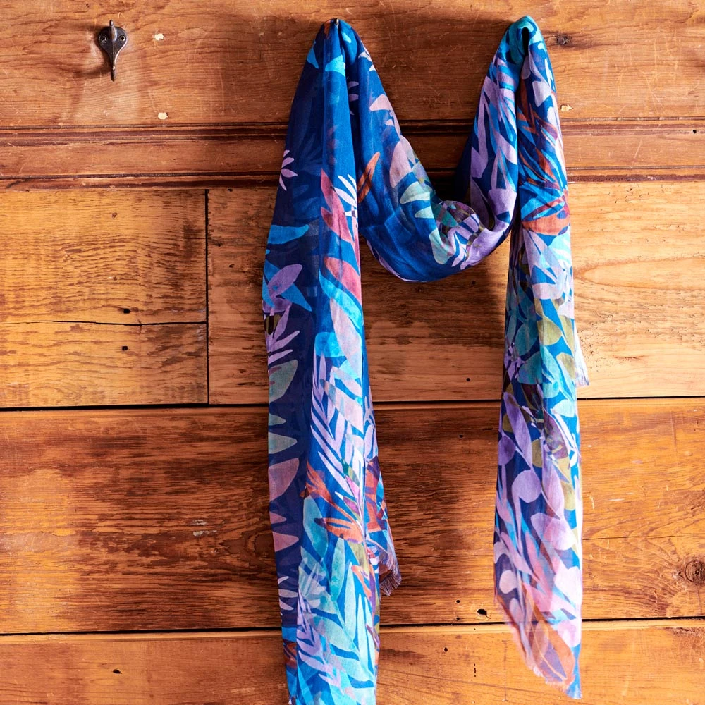 Pacific blue provides a rich background color for a bold botanical motif rendered in shades of lavender, teal blue, russet, and various shades of greens. This stylish, versatile scarf is made of soft, earth-friendly modal. The colors work beautifully in any season. A terrific gift or stocking stuffer.