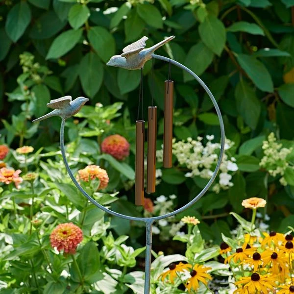 This charming wind chime features a pair of birds fluttering at facing ends of a sculptural open ring. Install anywhere in your garden using its sturdy, two-pronged stake, and enjoy the harmonious chiming of the three aluminum tubes suspended within the ring. This unique garden décor is easily repositioned and adds beauty and sound wherever you place it.