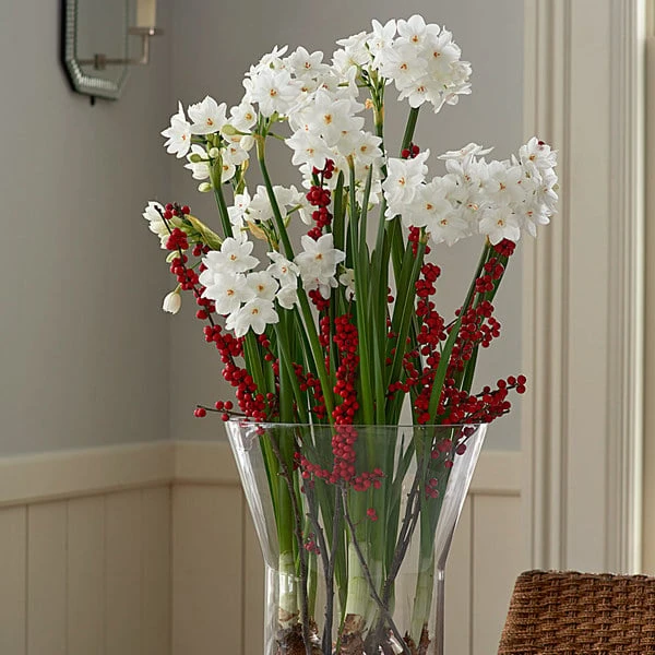 The fragrant, snowy white clusters of Paperwhites make a dramatic centerpiece or holiday bouquet, especially when paired with the red berries of Winterberry Holly (Ilex verticillata) in our wide hurricane vase. Our Winter Solace Kit includes everything you need to grow these festive bulbs all season.