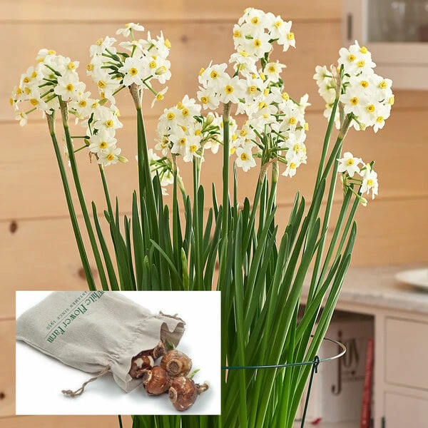 Paperwhites require no preparation and are absolutely foolproof. When bulbs are planted in early December, they will flower in 4-6 weeks with seldom a miss. If you start your plantings at 2-4 week intervals you can keep the show running all winter. Bulbs may be held for weeks in a warm, dark closet, which allows plenty of flexibility in orchestrating displays for holidays or other special occasions.