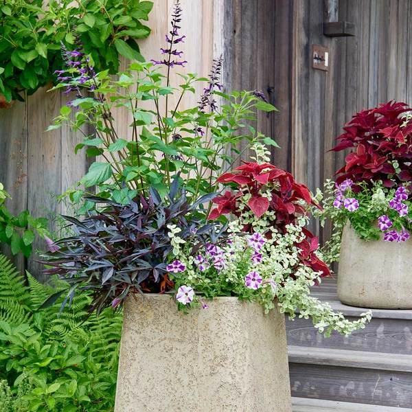 Our Pollinator Pleaser Annual Collection will attract hummingbirds with over a long season, the tall spires of Salvia ‘Amistad’ with their dark, near-black bracts and royal purple blossoms providing nectar while supported by the richly colored burgundy foliage of upright Coleus ‘Oxblood,’ the deeply dissected leaves of cascading Ipomoea batatas Ipomoea batatas Spotlight™ Black, the bicolor green-and-gray foliage of vigorous Helichrysum petiolare ‘Variegatum,’ and the two-tone, purple-and-white pinwheel flowers of Petunia Headliner™ Blueberry Swirl. 1 plant of each for a total of 5 plants. Container not included.