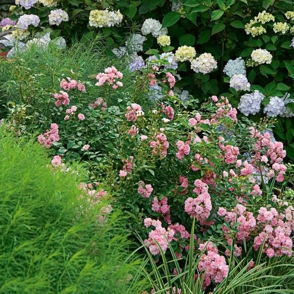 A Polyanthus type, Rose ‘The Fairy’ produces a cloud of small, fully double pink flowers all summer with an especially heavy flush of bloom in fall. The bush is compact, seldom growing above 2′, which makes it effective as a ground cover, a low hedge, or a powerful presence in a mixed border. How such a little bush makes so many flowers is a mystery. Own-root.