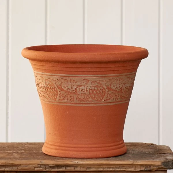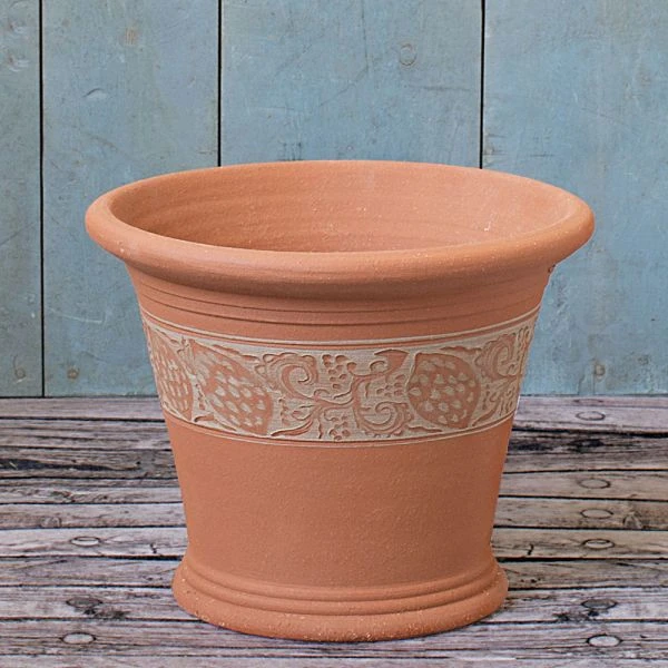 From the timeless, beautifully rendered line of handcrafted Whichford Pottery comes this handsome vessel detailed with a decorative band with a repeating pattern inspired by Sicilian Lemons. This all-purpose pot is sized just right for annuals, herbs, and small Lemon trees. Ornate enough to be used inside the house and superb for outdoors. We recommend the use of larger bark mulch or a wire mesh screen to cover the drainage hole.