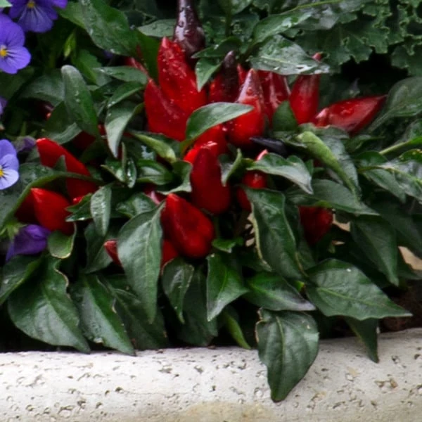 This container collection looks good enough to eat! And while each item is indeed edible â from leafy Kale and zesty Peppers to the colorful petals of Marigolds and Violets â we especially recommend our Spicy Kale Fall Collection as a feast for the eyes. Fiery tones of Ornamental Pepper âPurple Shadesâ and Tagetes patula DurangoÂź Red, a French Marigold with large russet blossoms, appear even warmer alongside the icy blue blooms of Violets (Viola cornuta SorbetÂź XP True Blue) and the blue-green, purple-tinged leaves of Ornamental Kale Kamomeâą Red (which intensifies in color as the weather cools). Our recipe not only includes contrasting colors but interesting textures, as well. The rough, curly Kale foliage makes a perfect backdrop to show off the sleek, shiny fruits of the Ornamental Pepper. Savor this scrumptious-looking collection from late summer to frost.