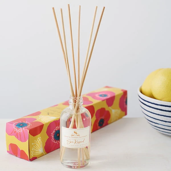 Spread a little sunshine with the citrusy, floral fragrance of the Sun Kissed Reed Diffuser. Housed in a classic, clear glass apothecary bottle, the refreshing and revitalizing scent is as cheerful as the package it comes in. Unscrew the top of the bottle, insert the rattan reeds, then flip them and reinsert. The diffuser lasts up to six months. The diffuser is made in the USA by a woman-owned company. All fragrances are made without alcohol, phthalates or parabens. The formulation is VOC-compliant, vegan, and never tested on animals.