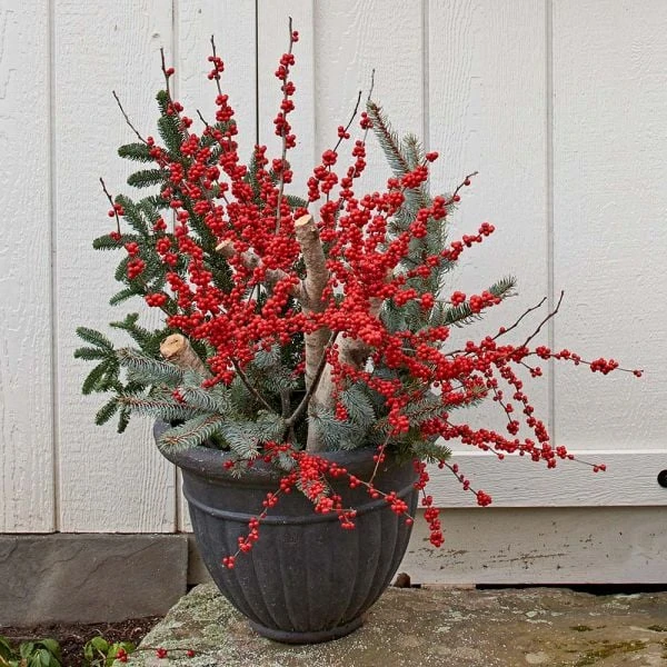 The bright red berries of our native deciduous Holly, Ilex verticillata, are prized for decorating alone or with fresh greens. We also like to place Winterberry stems in vases of forced Paperwhite Narcissus bulbs. Four stems, each 24â30″ long.