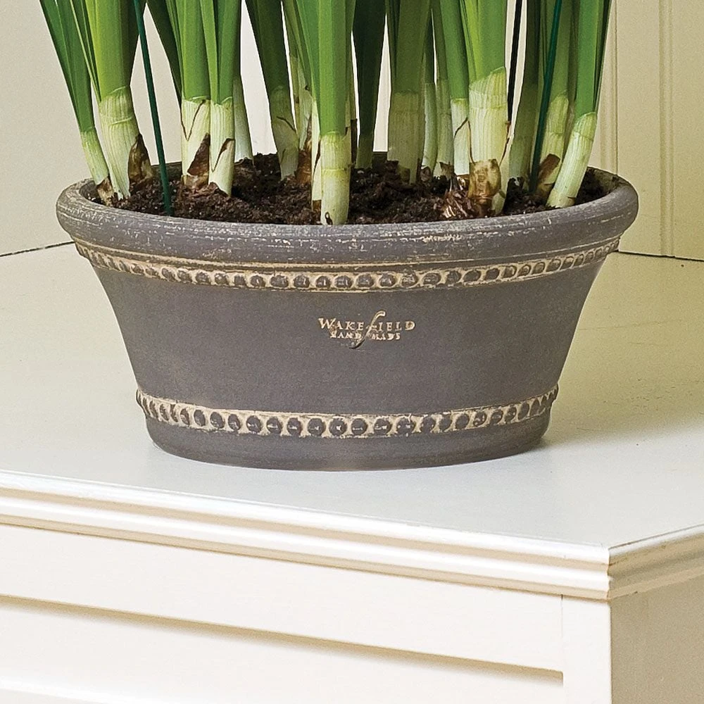 The broad, shallow Wrenthorpe Pancheon bowl looks stunning filled with Paperwhite Narcissus bulbs. We are also fond of it for showing off summertime displays of Caladiums and Begonias. Crafted with a rounded rim and 2 bands of pearl-like patterning. No drainage hole.
